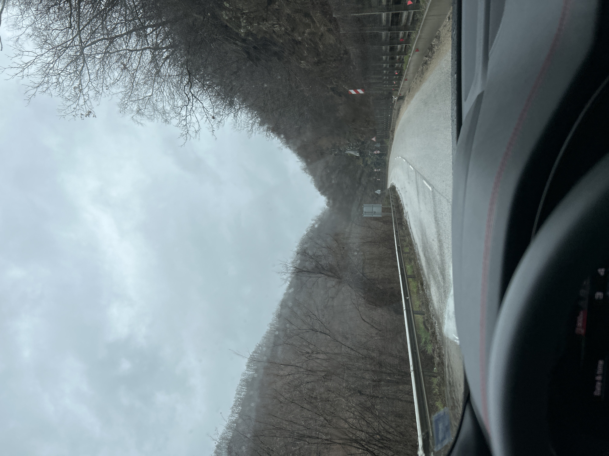 The image, taken from the interior of a vehicle, depicts a winding road in a mountainous area. The sky is overcast. Dense, bare trees line the hillsides on either side of the road. A safety barrier runs along the road's edge. Signs and other road infrastructure are visible. The location is Hvoina, Bulgaria. The image suggests a drive along a remote, mountainous road on a gray day.