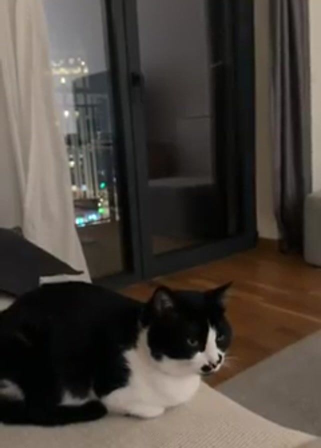 A black and white cat sits on a light-colored couch in a room. A sliding glass door is visible in the background with city lights beyond it. A gray curtain is to the right of the door. The floor is hardwood. The cat wears a pink collar and stares to the right.