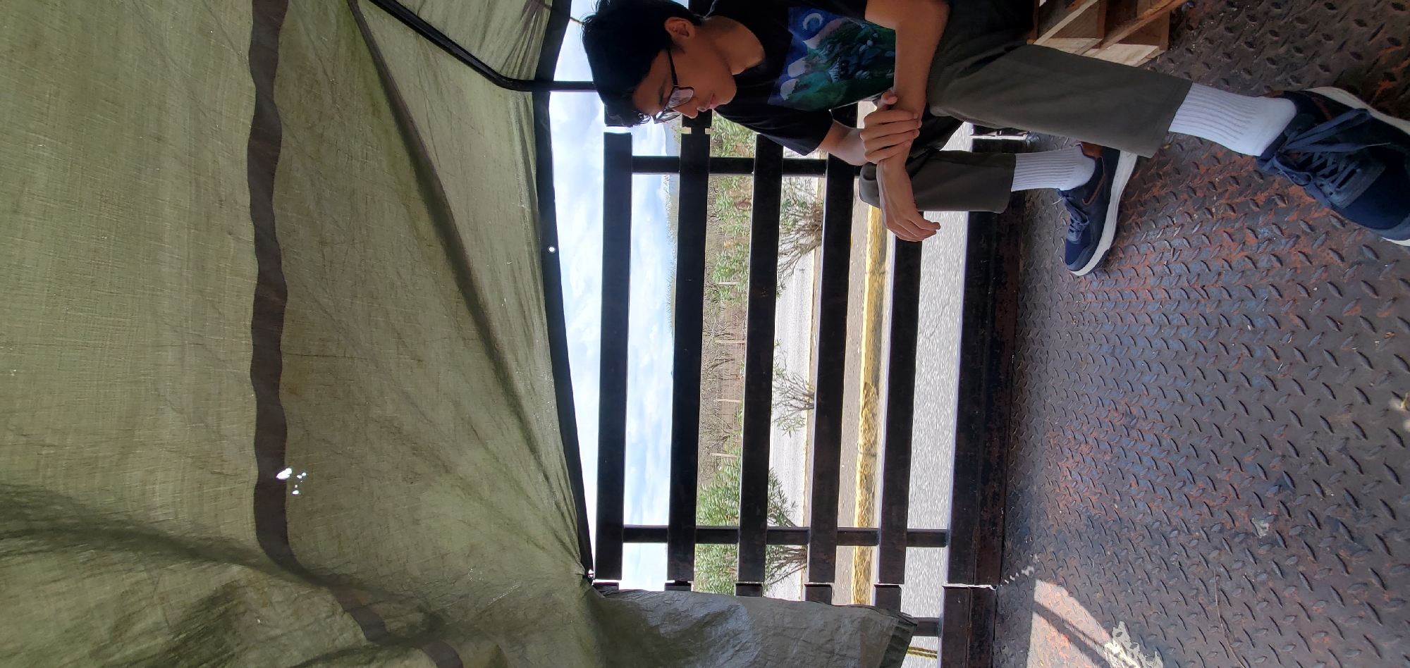 A young man wearing a black T-shirt with a printed design, glasses, and a baseball cap is sitting on the edge of what appears to be the back of a truck. He is wearing olive-green pants and white socks with blue sneakers. The truck bed is made of diamond-plate steel. He is looking down at his hands, which are clasped together. A green tarp is partially covering the view to the left. The background shows a road and some vegetation through the bars of the truck's frame. The sky is visible between the bars. The location is Cabudare, Venezuela.
