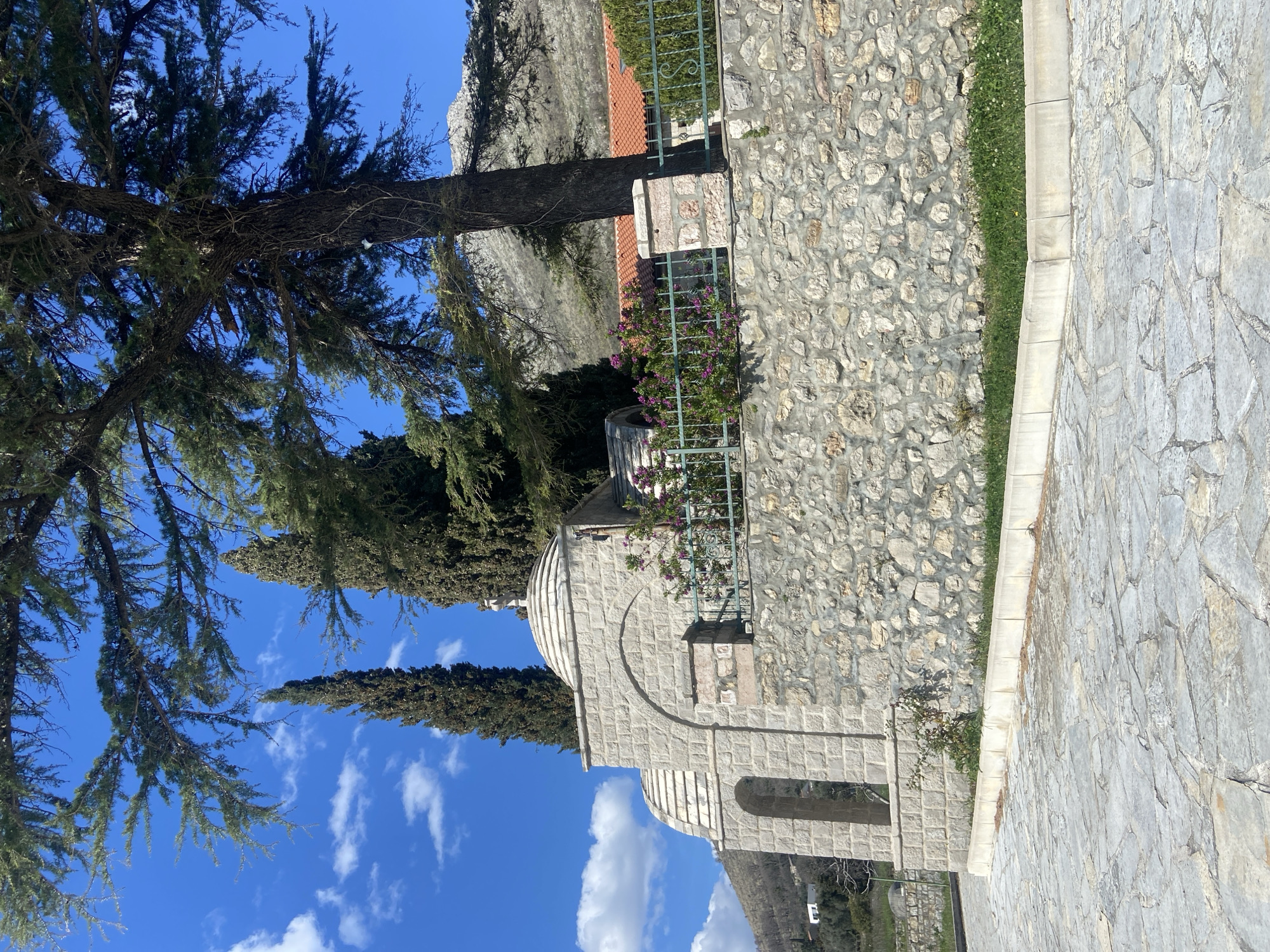 The image displays a sunny daytime scene in Donji Katun, Montenegro, featuring stone architecture and natural elements. In the foreground, a paved surface composed of irregularly shaped light grey flagstones extends across the lower portion of the frame. This paving abuts a low, grey concrete curb that separates it from a narrow strip of green grass. Behind the grass strip and curb, a robust stone wall constructed from rough, light grey, unevenly shaped stones dominates the mid-ground. Integrated into the left side of this wall is a small, light-colored stone structure with an arched opening and a small, dome-shaped roof made of flat grey tiles. Further right along the wall, another stone structure, partially obscured, features a larger dome-shaped roof with similar tiles, topped by a small cross. This structure is fronted by a green metal fence with decorative scrollwork, behind which are visible bushes with vibrant purple flowers. Above and behind the wall, dense green foliage from various trees is prominent. To the left, two tall, slender coniferous trees with dark green needles stand prominently against the sky. Centered in the upper right, a larger evergreen tree with a thick trunk and wide, dark green branches extends into the upper frame. Portions of red-tiled roofs are visible through and behind the trees and fence in the mid-ground. The background reveals undulating mountainous terrain under a clear blue sky dotted with scattered white cumulus clouds. The mountain slopes appear lightly vegetated. No people, animals, or specific actions are depicted. The scene is brightly lit by natural sunlight, casting visible shadows.