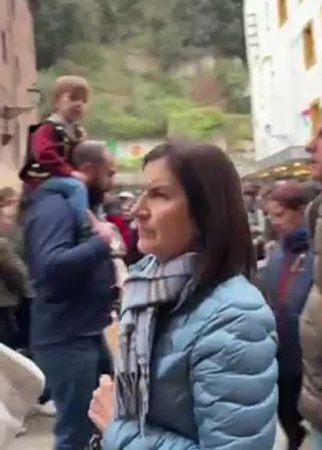 crowd of people moving along a narrow street, possibly in a European town. Many people are wearing winter clothing. There are older and younger people present, including children. The architecture of the buildings is diverse, with both older, more ornate structures and simpler, more modern buildings visible. Some people are carrying children on their shoulders. There is a lot of movement and activity in the scene. The overall impression is that of a busy, possibly festive event taking place in the town.