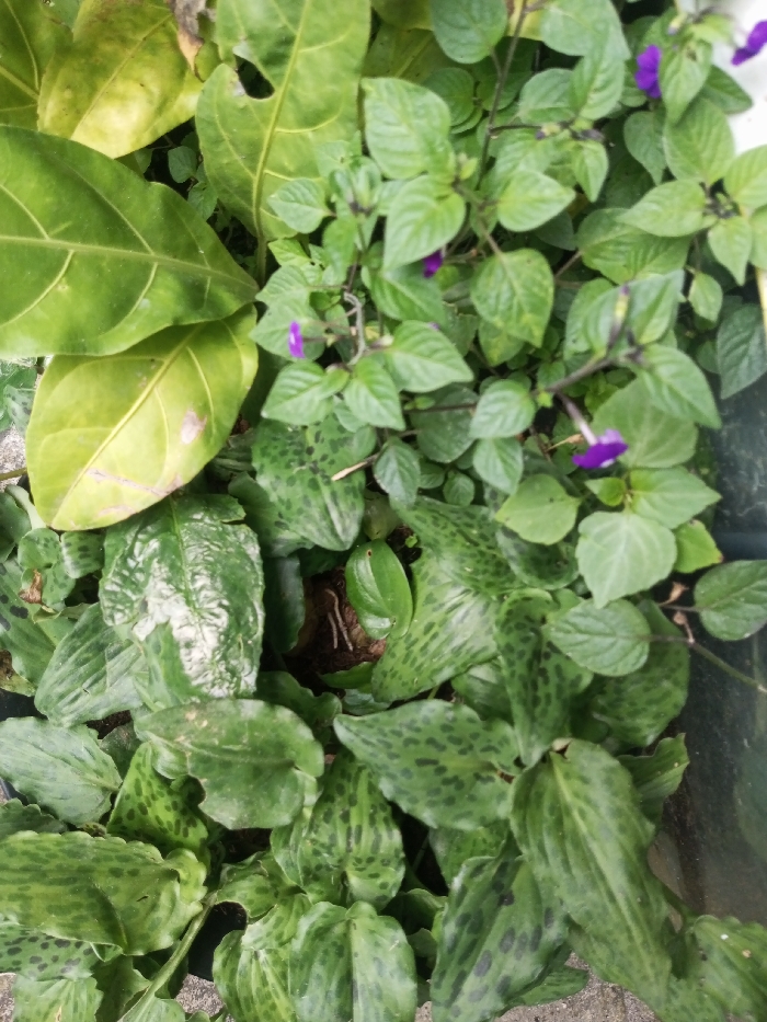 The image displays a vertical, close-up perspective of a dense assortment of green plants, reportedly in Bhendala, India. The composition is dominated by foliage from multiple species. In the upper left, large, light-green leaves exhibit areas of yellowing and minor physical damage. The upper right and central sections feature a plant with numerous small, ovate, medium-green leaves and several vibrant purple, trumpet-shaped flowers, some of which are in bud. The lower half of the frame is covered by dark green leaves characterized by distinct, irregular dark spots and a textured, somewhat crinkled surface. Dark soil is visible in limited patches between the dense plant growth. No individuals or explicit man-made objects are discernible within the frame; the scene is static.