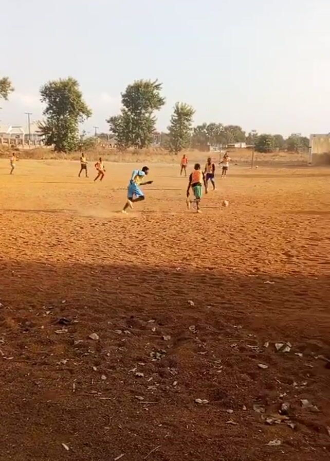 group of people playing soccer on a dusty, brown field. The sky is light and clear. Several trees are visible in the background, along with what appears to be a building and power lines. Most of the players are wearing bright orange jerseys and dark shorts, while one or two wear blue. The players are actively running and kicking a soccer ball. The field appears to be dirt or sand, with some dried leaves or debris scattered across it. The video is shot at a distance, providing a view of the whole field.