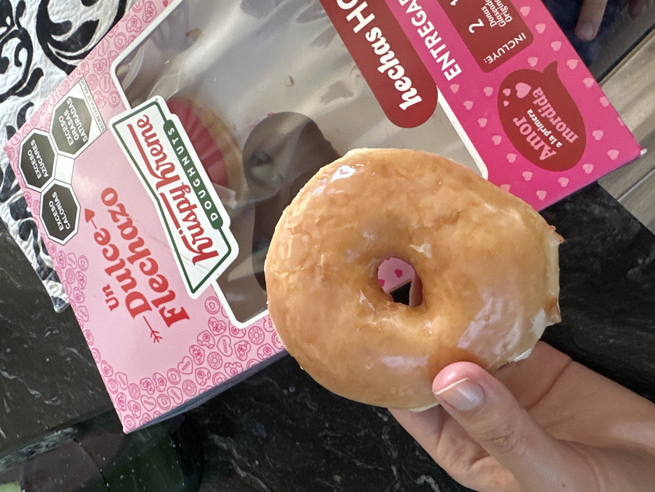 A glazed doughnut is held in a hand next to a pink Krispy Kreme doughnut box, which reads "Un Dulce Flechazo"