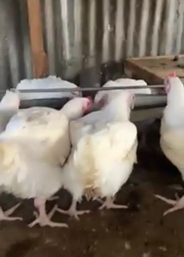 cluster of white chickens huddled together inside what appears to be a coop. The coop has corrugated metal siding and a wooden frame. The chickens are tightly packed, standing on what appears to be dirt or litter. A hanging water feeder is visible. The chickens move their heads and necks, seemingly pecking at the ground.