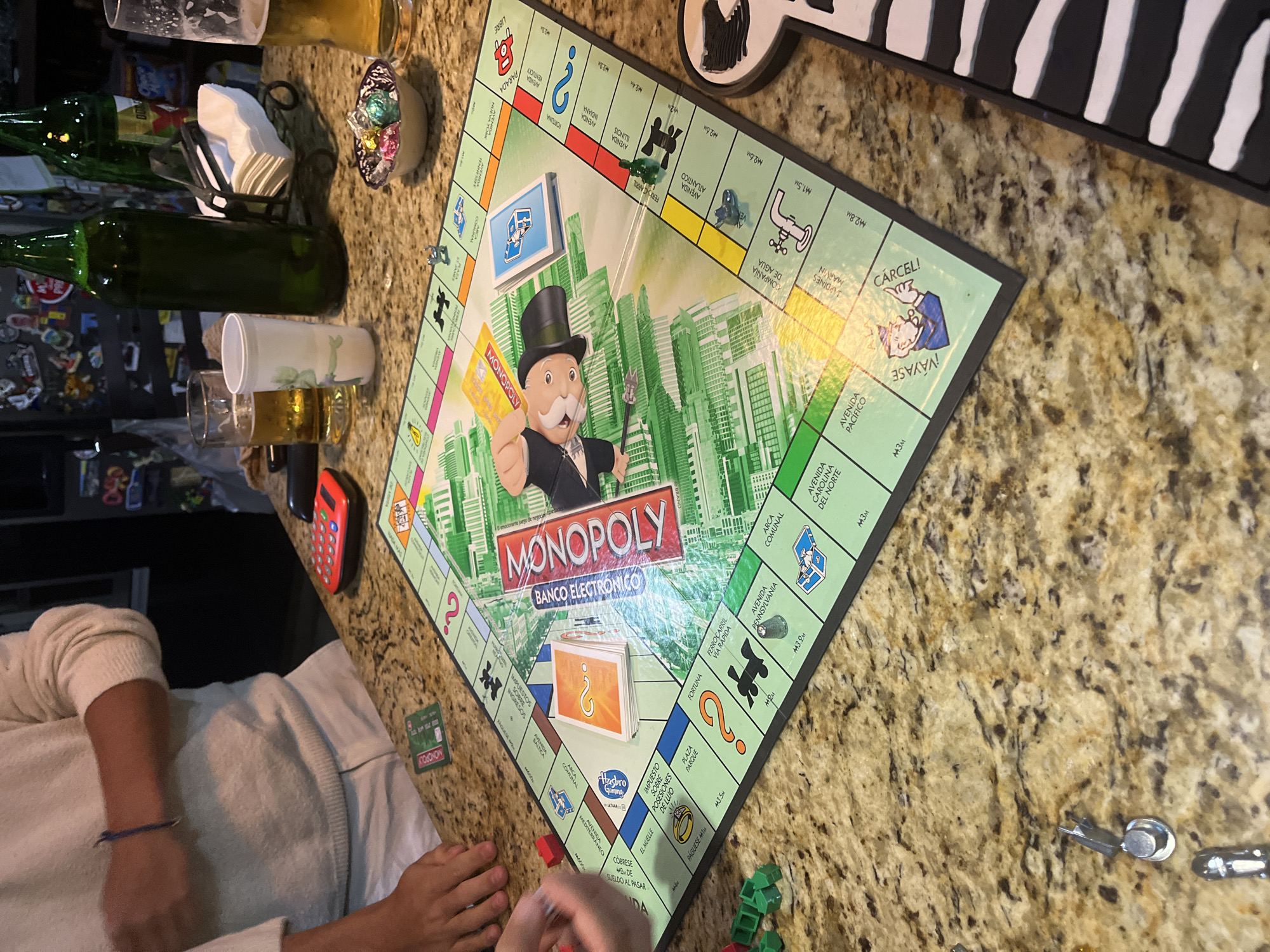 A high-angle shot shows a Monopoly board game in progress on a countertop with a speckled brown and beige pattern. At least two people are involved in the game, as suggested by the presence of two hands on the left and bottom edges of the frame. The Monopoly board is the "Banco Electronico" version in Spanish, with game pieces and money visible. A red electronic banking device rests on the counter next to the board. Several green bottles, a white plastic cup, and a glass with beer sit to the left of the board. A zebra-striped object is on the top right of the board. The Monopoly version says it's a negotiating game. The location, Cholula, Mexico is not evident from the image.