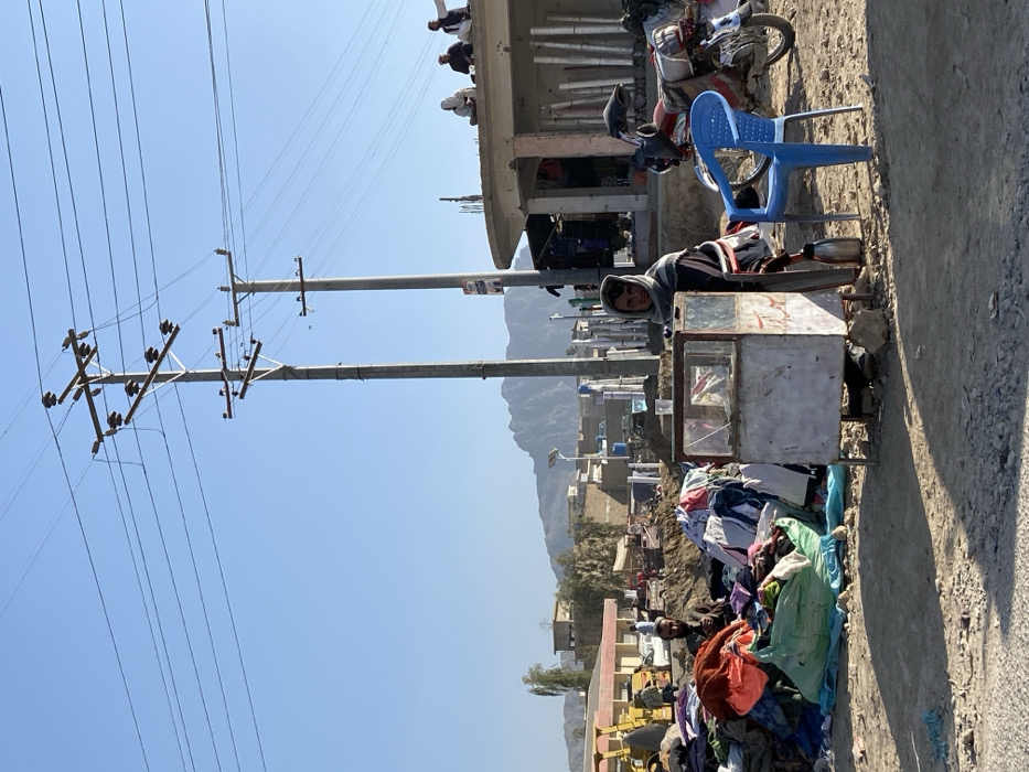 This image depicts a dusty urban street scene in کوکران, Afghanistan, under a clear, bright blue sky. In the foreground, a prominent dirt and gravel ground surface shows shadows cast from the mid-morning or early afternoon sun. To the left, large piles of folded and bundled clothing, likely used merchandise, are spread on the ground and partially contained in green sacks. A man with a beard and head covering sits among these clothing piles, looking down. Centrally positioned, a light-colored, glass-fronted vendor cart is present, with an individual standing behind it, facing forward. This individual wears a striped shawl or head covering and holds a silver thermos. To the right of the cart, a bright blue plastic chair is placed, and behind it, a red motorcycle is parked. In the midground, the scene reveals ongoing construction and urban activity. A large yellow construction vehicle, possibly a bulldozer, is partially visible on the far left. Mounds of dirt and debris indicate recent excavation or construction work. Dominating the upper midground are two tall, grey concrete utility poles with multiple cross arms supporting numerous electrical or communication wires that stretch across the frame. To the right, an incomplete round concrete building structure with exposed rebar and timber supports suggests active construction. Three men are seated on the rooftop of this structure, two of whom wear light-colored traditional attire and head coverings, while the third is darker. The background features a range of low-rise buildings, some appearing residential and others commercial, extending into the distance. Beyond these structures, a large, rugged mountain range rises under the expansive blue sky, defining the horizon. The overall environment appears dry and open, indicative of a busy marketplace or developing urban area.