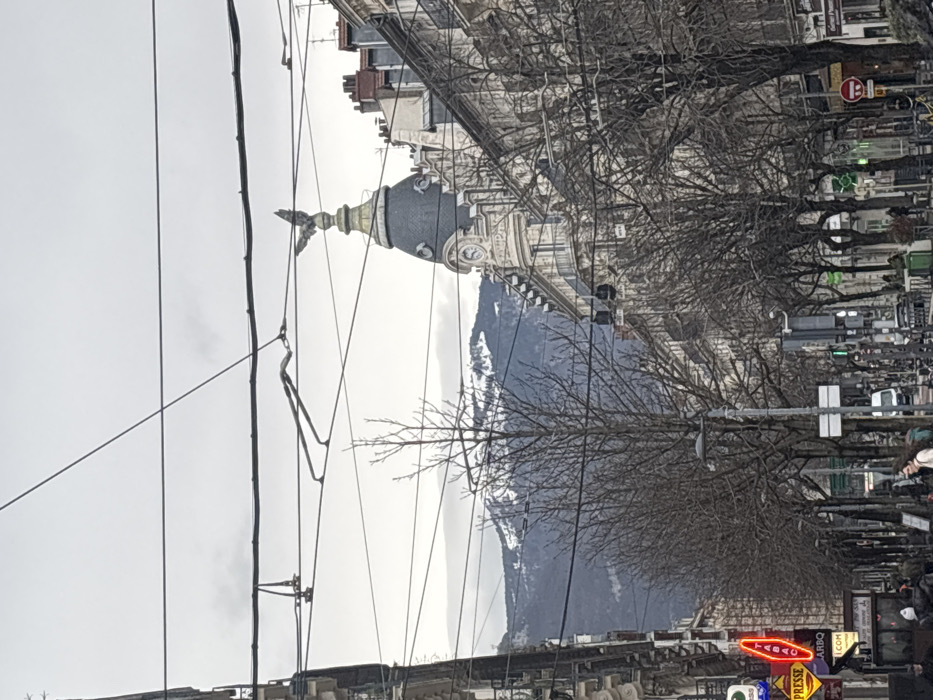 A European street scene shows a building with a domed roof topped with a bird sculpture. A clock is visible on the building's facade. Mountains loom in the background. Bare trees line the street, obscuring some of the buildings. Power lines crisscross the sky. Shop signs, including one for "Tabac", are visible at street level. The overall impression is of a grey, overcast day.