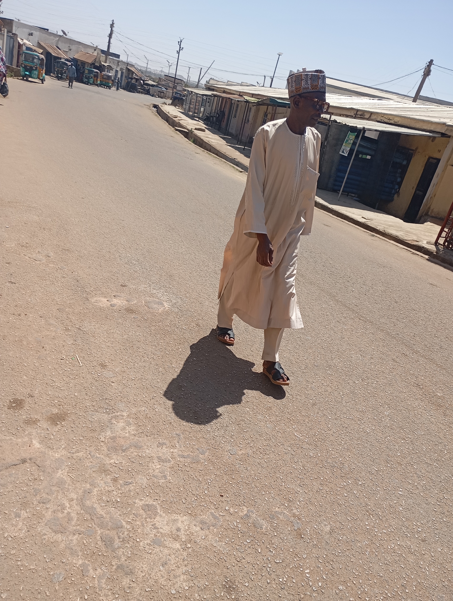 A male individual walks eastward on an asphalt road in a commercial district of Jos, Nigeria. He is dressed in a light cream-colored traditional tunic with embroidered detailing, matching cap, dark sunglasses, and dark sandals. His shadow is cast to his left on the road surface, indicating bright overhead sunlight. The road exhibits wear, with visible aggregate and lighter patches. To the left, several motorized tricycles are visible, along with other individuals further down the street. Both sides of the street are lined with single-story structures, consistent with shops or stalls, featuring corrugated metal roofs and various faded paint colors. Utility poles and overhead wires are present. The sky is clear and blue.