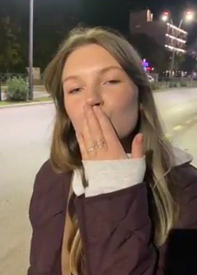 A young woman stands on a city sidewalk at night. She has shoulder-length brown hair and wears a brown jacket over a tan top and white hoodie. She has a ring on her finger. She blows a kiss toward the camera. There is a street with sparse traffic behind her, illuminated by streetlights. Buildings are visible in the background.
