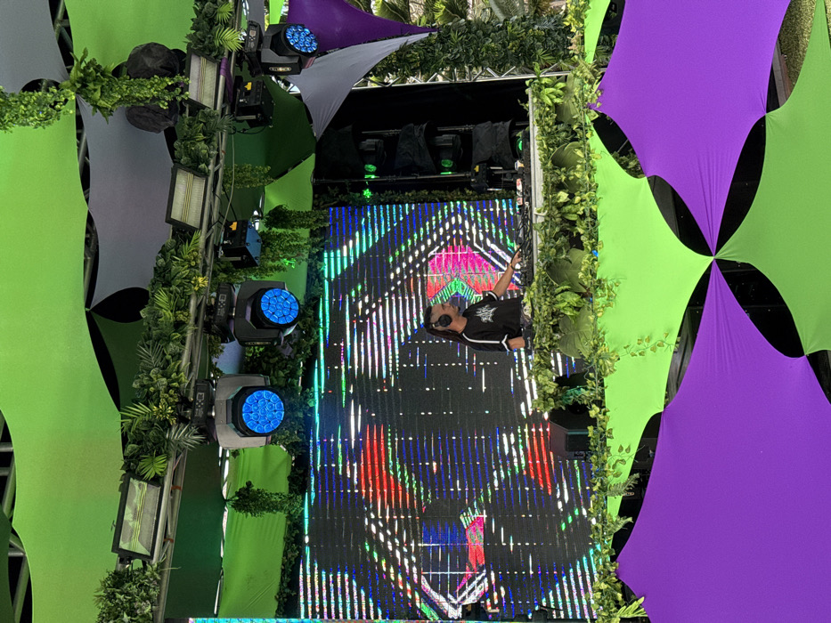 The image depicts an outdoor music stage setup in Noumea, France. A male individual, identified as a DJ, stands behind a white console. He has dark skin, dreadlocks, and wears a black t-shirt with white shoulder stripes and headphones. His right hand is positioned on the console's equipment. Behind him, a large rectangular LED screen displays a digital pattern of horizontal and vertical lines in green, blue, red, and white. Above the screen, a metal truss structure is fitted with multiple stage lights, including two circular moving head lights emitting blue illumination and several rectangular floodlights. Artificial green foliage and vines are integrated throughout the stage, wrapped around the trussing, bordering the screen, and adorning the console. Overhead, a canopy of lime green and grey fabric panels is stretched. To the right of the LED screen, a stack of dark-colored line array speakers is visible. The foreground shows additional lime green and purple fabric panels. The scene is illuminated by natural light.