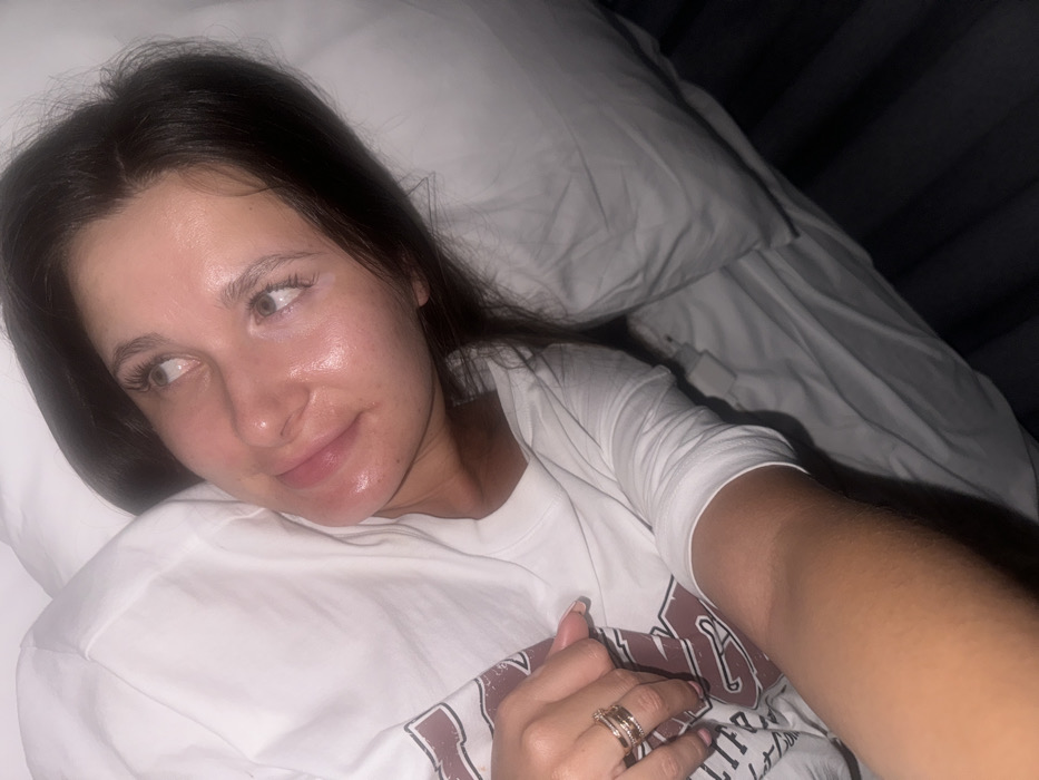 A woman with dark hair lies on a white bed. She wears a white t-shirt, and her hand, adorned with multiple rings, is visible near her chest. The bedding appears to be soft and plush. The lighting is dim, creating a relaxed atmosphere. The woman's gaze is directed off to the left.
