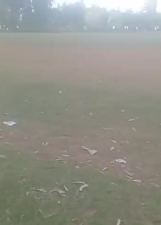 The camera pans over a grassy field with scattered debris. In the background, blurred figures and trees are visible under a hazy sky. Someone is speaking, seemingly about kicking a head.