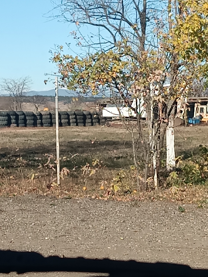 The image depicts an outdoor, semi-rural scene in Krtsanisi, Georgia, under clear, bright daylight. The foreground consists of a gravel-covered ground surface with a dark, irregular shadow cast along its bottom edge. Immediately above the gravel, sparse dry grass and low-lying vegetation, some with yellowish-green leaves, transition into a larger field of dry, brownish-green grass. In the midground, a slender, light-colored vertical pole stands slightly left of center. To its left, a long, continuous line of black objects, identified as vehicle tires, is horizontally stacked approximately 3-4 units high, forming a barrier or storage area. Behind these stacked tires, a larger tan-colored four-legged animal is visible in the distance on the left. To the right of the tire stacks, further back, a white rectangular structure is present, alongside indistinct industrial or storage-type objects, including a yellow piece of machinery and some blue containers. A small, light-colored, four-legged animal stands in the field to the right of the pole. A prominent deciduous tree with mostly bare branches and some remaining yellowish-green leaves occupies the right portion of the midground, partially obscuring a white vertical post or structure behind its trunk. Another bare, branched tree stands further back on the left. The background features distant, hazy mountains or hills stretching across the horizon, beneath a clear, cloudless blue sky. A band of darker vegetation, consistent with distant trees or forest, separates the midground field from the mountain range. No human figures are visible.