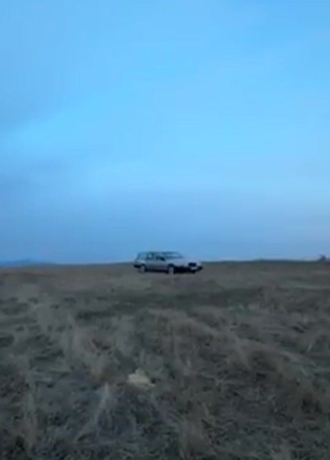 silver Volvo station wagon parked on a grassy hill under a light blue sky. The grass is mostly brown and dry. The car is facing the camera. There are mountains visible on the horizon.