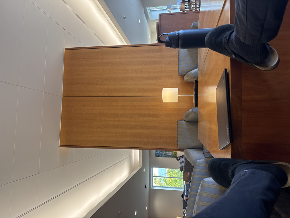 A first-person perspective photograph captures an interior lounge or common area within a building in Waltham, United States