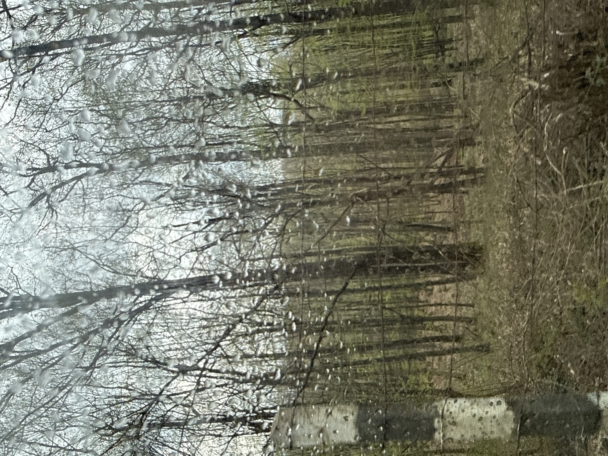 The image depicts a rainy view of a forest through a window, likely a car windshield. Bare tree branches are visible in the foreground, obscured by raindrops. Beyond the trees, the forest floor is covered in fallen leaves and sparse vegetation. A concrete or stone barrier is partially visible at the bottom of the frame, possibly a retaining wall or roadside divider. The scene lacks any discernible urban elements, making it impossible to definitively confirm its location within the city of Slatina, Bulgaria based solely on visual information. No people, subjects, or actions are observable in the picture.