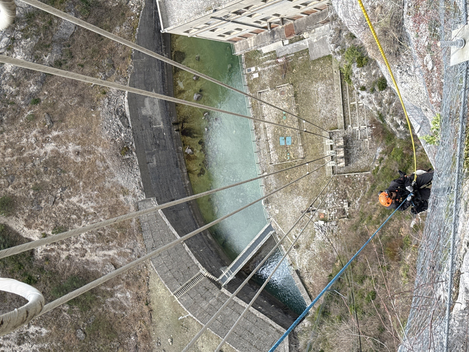 The image captures a high-angle, downward view of a steep rock face overlooking dam infrastructure and a power plant building in Castellane, France. One individual is centrally positioned on the rock face, actively descending or working on ropes. The person is equipped with a dark-colored jacket, trousers, gloves, and an orange climbing helmet, secured by a harness to multiple ropes, including prominent blue and yellow lines. The rock face in the foreground is steep, grey, and partially covered by a metallic rockfall prevention netting. Below the individual, several white ropes extend vertically towards a complex of concrete structures. The background reveals a large, curved dam impounding a body of turquoise-green water. To the left, a multi-tiered concrete structure with steps descends into the water, likely a spillway or channel. A narrow bridge or walkway spans a section of the dam. On the right bank of the water, a multi-story, light-colored industrial building, consistent with a hydroelectric power plant, stands with numerous windows. The immediate surroundings of the dam and building consist of rocky, sparsely vegetated terrain and flat concrete platforms with various utility fixtures.
