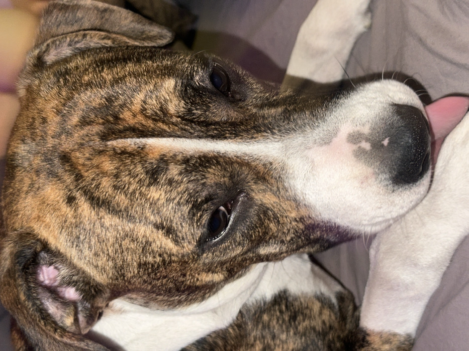 - "A brindle and white dog is depicted in a close-up view, positioned on a light purple/grey wrinkled fabric surface in Trudovaya, Russia" by FM-2t2Dl2, licensed under CC BY 4.0
