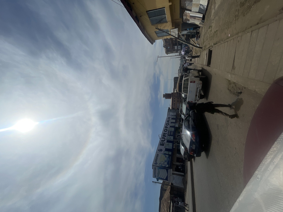 The image depicts a daytime urban street scene in Dadi Riba, Nigeria, viewed from a low angle, possibly from inside a vehicle. The sky features a bright, intense sun exhibiting a prominent solar halo, with scattered clouds. The street, a paved asphalt road, shows moderate traffic. On the left side of the road, a large commercial building with multiple storefronts is visible, prominently featuring "EUROFOAM" branding in blue and white, suggesting a mattress or foam product retailer. Several vehicles are parked or in motion in front of this building, including a dark-colored sedan. Further down the street, an older, reddish-brown building with a tower structure is visible in the distance. On the right side of the image, a two-story building painted yellow dominates the foreground. Rectangular slabs, possibly tiles or marble, are stacked vertically along its base. A wooden pole leans against the building, with power lines or communication cables attached. A concrete sidewalk runs alongside this building, transitioning into an unpaved, dusty area closer to the building's foundation. Multiple individuals are present: one person in dark clothing walks on the road in the mid-ground, heading away from the viewer. Other pedestrians are visible on the sidewalk further down the street on both sides, suggesting general public activity. A white pickup truck is positioned on the road to the right of the person walking, with other vehicles beyond it. The overall environment suggests a commercial district with mixed-use buildings.