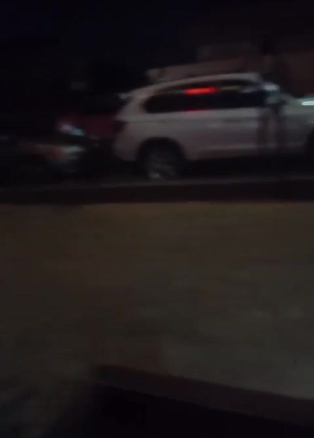 The video, shot at night under low-light conditions, shows a street scene with parked cars