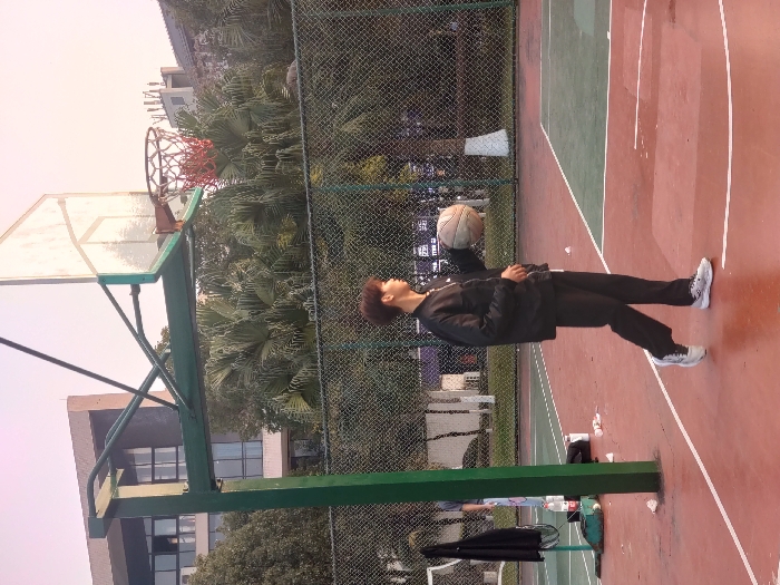 The image displays an outdoor basketball court located in Jiangjin, China. The court features red and green sections outlined with white lines. A male individual with short dark hair, clad in a black long-sleeved jacket, dark trousers, and light-colored athletic shoes, stands on the red portion of the court. He holds a light-colored basketball in his left hand, positioned near his left hip, and is looking towards the right side of the frame, with his left foot slightly elevated. To the left, a green metal basketball hoop structure with a clear backboard and a red net is prominent. A black garment is draped over a support near the base of the hoop, alongside a clear plastic bottle with a red cap and several pieces of white crumpled paper discarded on the court. A second individual, wearing a light-colored top, is partially obscured behind the main pole of the basketball hoop. In the background, a wire mesh fence separates the court from dense green foliage, including palm trees, and modern multi-story buildings with large windows. The sky is a light, somewhat hazy pinkish-blue.
