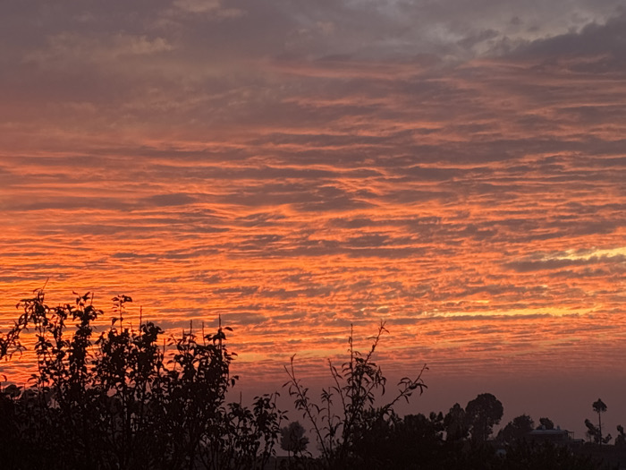 The image displays an outdoor scene in Kasar Devi, India, captured during either sunrise or sunset. The upper two-thirds of the frame are dominated by a sky filled with numerous horizontally elongated, wave-like cloud formations, consistent with altocumulus or cirrocumulus, intensely illuminated in shades of vivid orange and red. These vibrant colors transition to a muted grey-purple at the very top of the frame. The lower third of the image contains a dark silhouette of dense vegetation, consisting of multiple trees and shrubs with visible branches and foliage, obscuring the immediate foreground and a portion of the horizon. A faint, darker silhouette of distant terrain or possibly structures is discernible below the primary cloud layer. No individuals, overt actions, or interactions are depicted within the scene. The lighting conditions are indicative of crepuscular periods.