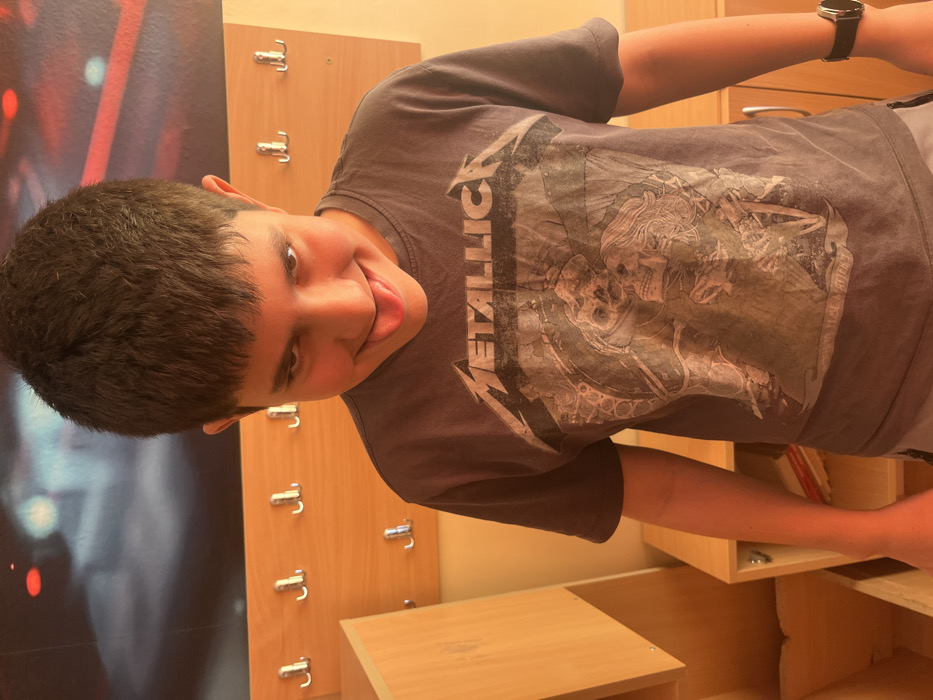 A young boy wearing a gray Metallica t-shirt sticks his tongue out towards the camera. He has short, dark hair and a playful expression. Behind him are wooden lockers with metal hooks and a portion of a colorful wall graphic is visible on the left side. The boy is standing inside, with some cabinets to his right, and his watch is visible on his wrist.