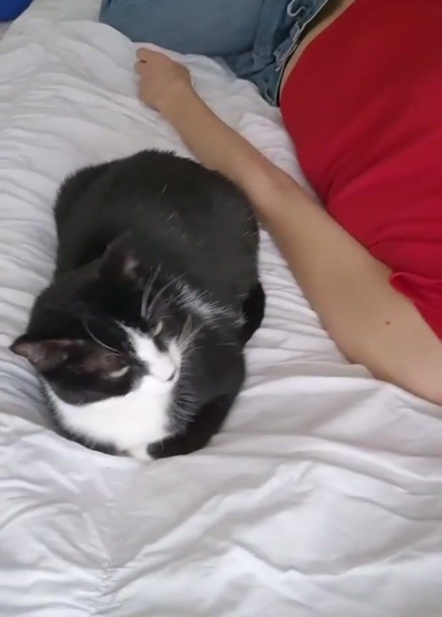 A person is lying on their back in a bed with white sheets. They are wearing blue jeans and a red top. A black and white cat is lying on the bed near the person. The person looks at the camera and puckers their lips.