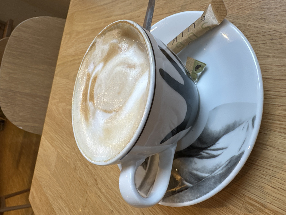 - "The image displays a close-up, slightly elevated perspective of a white ceramic coffee cup, filled with a latte or cappuccino, exhibiting distinct latte art swirls on its foamy surface" by FM-cmwts1, licensed under CC BY 4.0