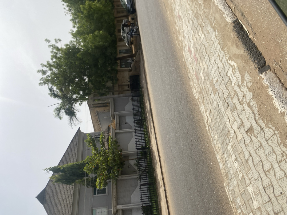 The scene depicts a street in the city of Muhammadu Dikko Stadium, Nigeria, under a bright, hazy sky. In the foreground, an asphalt road occupies the left half, bordered on the right by a patterned concrete sidewalk, light in color with a repetitive wave-like design, partially covered by sand and dirt. A low curb separates the road from the sidewalk. To the left, a large, modern-style grey building with a dark, multi-sloped roof and white-framed windows is visible behind a tall perimeter wall. This wall is light grey with decorative wavy elements in a lighter shade and is topped with what appears to be security wiring or spikes. A black wrought-iron fence runs along the sidewalk in front of this wall, with green vegetation visible behind it, including a tall, slender tree and a broader, leafy tree. To the right, beyond a gap in the buildings, a prominent palm tree stands, followed by a dense row of green, deciduous trees. Partially obscured by these trees and in front of older, light-colored buildings, are several parked vehicles. These include a light-colored sedan with visible body damage to its side, a darker sedan parked behind it, and a motorcycle closer to the foreground near the sidewalk. At least two individuals are visible near the damaged light-colored sedan; one wears a light-colored top and dark trousers, and both appear to be standing or interacting near the vehicle. Another indistinct figure is visible further down the street near the tree line.