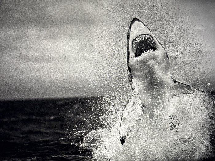 - "A black and white photo showcases a great white shark leaping from the ocean" by FM-5oJwf2, licensed under CC BY 4.0