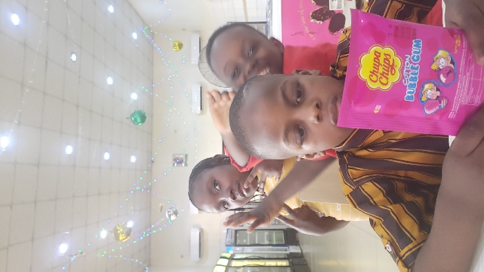 The image depicts an indoor scene in Sabon Tasha, Nigeria, featuring three children in what appears to be a commercial establishment or event space. In the foreground, a young boy with dark skin and short dark hair, wearing a yellow and dark brown striped shirt, holds a pink "Chupa Chups Cotton Bubble Gum" packet with both hands, looking down at it. Behind him to the left, a girl with braided dark hair, wearing a light-colored top, looks towards the camera, displaying a peace sign with her left hand. To the right, partially obscured, another child in a red top smiles broadly at the camera. The background reveals a brightly lit interior with a white grid-panel ceiling featuring numerous recessed lights and festive string lights adorned with metallic spherical ornaments in silver, gold, and green. Two white wall-mounted split-system air conditioning units are visible on the side walls. To the far left, a series of glass-front display refrigerators or freezers are present, while to the right, a large pink display cooler with text and graphics is visible.