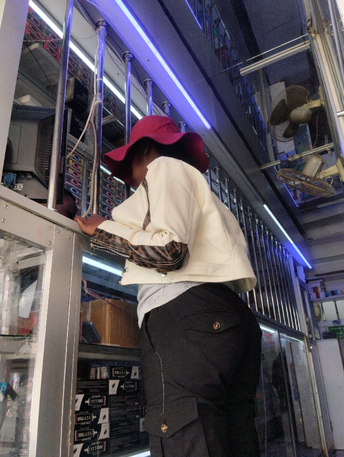 A person wearing a red hat, cream jacket with animal print sleeves, and black cargo pants stands beside a glass display case. The display case contains boxes and electronics. Above, blue lights illuminate a metal structure with vertical bars. In the background, fans are mounted on the ceiling. The angle is a low, upward perspective.