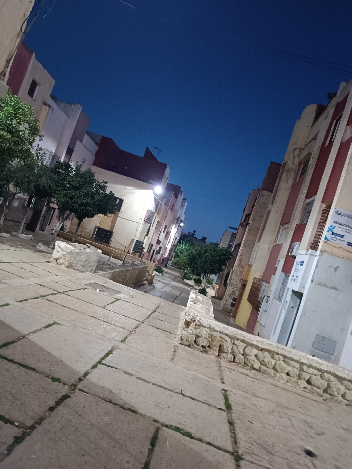 A nighttime street view features buildings with varying colors and architectural styles on both sides. Streetlights illuminate the scene, casting light on the paved ground, which is marked with rectangular patterns. A short, weathered stone wall lines the path, adding texture to the foreground. Trees with dense foliage are sparsely placed along the street. The sky is a deep, clear blue.