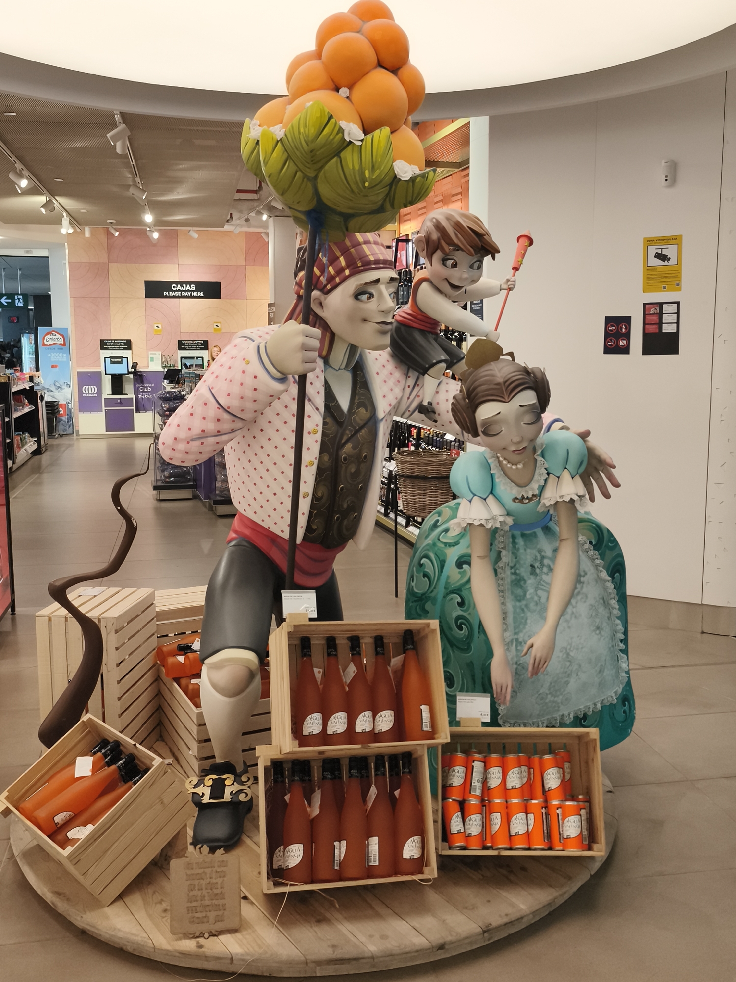 The image displays a prominent retail merchandise display situated within a supermarket or specialty store in Manises, Spain. The central feature consists of three large, stylized figures on a circular wooden platform. A male figure, wearing a patterned jacket, vest, red sash, and traditional striped headscarf, stands to the left, holding a dark, gnarled staff topped with a large, artificial cluster of oranges. To his right, a female figure in a light blue traditional dress with white lace and a pearl necklace is depicted with closed eyes, in a kneeling or seated posture. A small boy figure, wearing a red shirt and black shorts, is perched on the female figure's head, holding a red stick with a stylized firework. Surrounding these figures are multiple wooden crates containing bottles and cans of "Agua de Valencia" products. The background reveals typical retail store elements: aisles with shelving stocked with various products, brightly lit by overhead fluorescent lights, and checkout counters marked with a "CAJAS PLEASE PAY HERE" sign. A "ZONA VIDEOVIGILADA" sign is visible on a white wall to the right.
