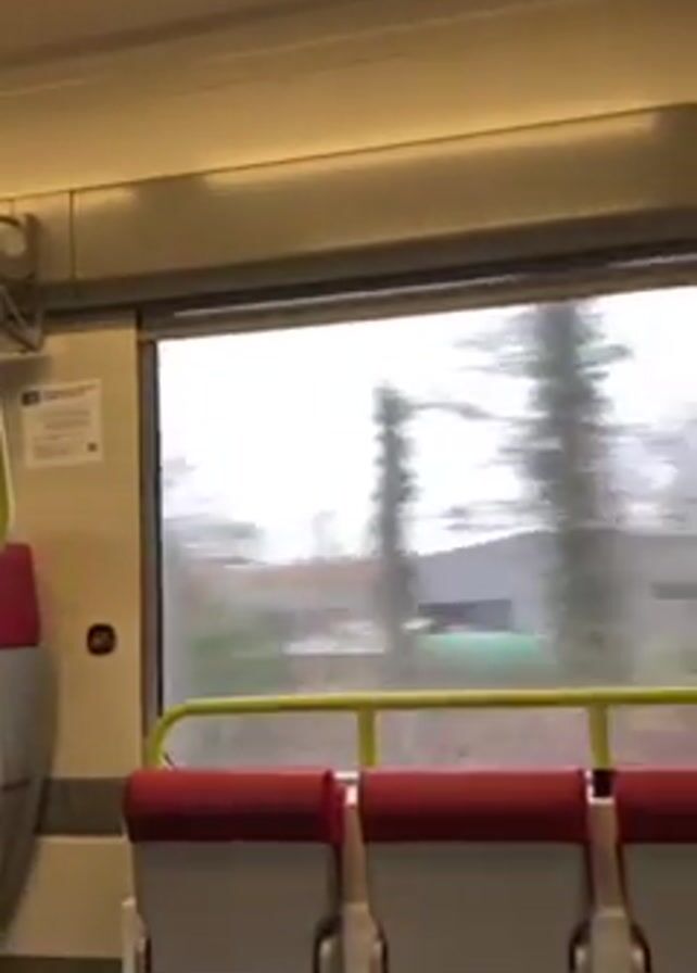 n interior view from a moving train. The camera looks towards the window, displaying a blurred view of trees and buildings passing by. The seats in the train are red and gray.