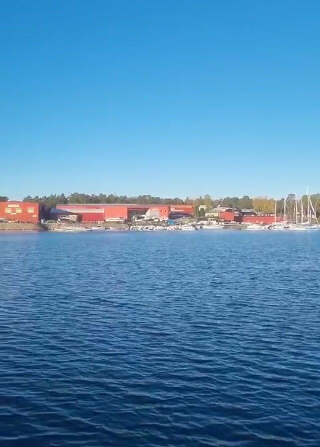 body of water, likely a lake or bay, under a clear blue sky. The water is rippled with small waves. In the distance, there is land with buildings, including one that is large and red, as well as trees and some boats docked along the shore. As the camera pans slightly, the view expands to show more of the waterway and the opposite shoreline with denser foliage.