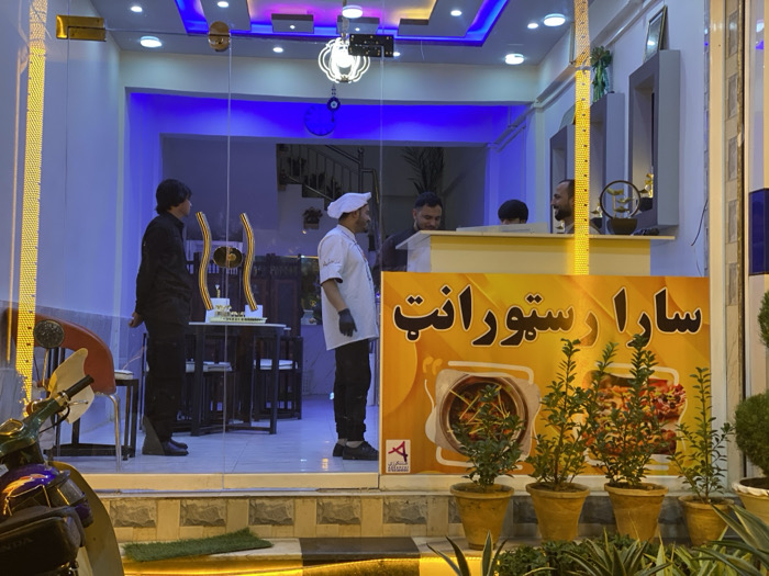 A restaurant's exterior is visible through a glass facade. Indoors, three men stand; one in a chef's uniform. A small table with a decorated cake stands nearby. The restaurant's name, "Sara Restaurant," is displayed on a yellow sign with a picture of food. Plants in pots decorate the entrance. A motorcycle is parked to the side, outside the entrance. The restaurant's interior includes blue lighting and a staircase visible in the background.