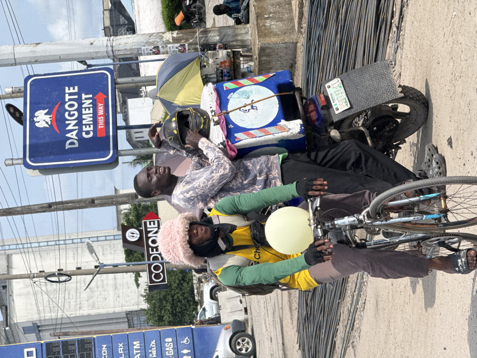 The image presents an outdoor street scene in Ikota, Nigeria, under daylight conditions