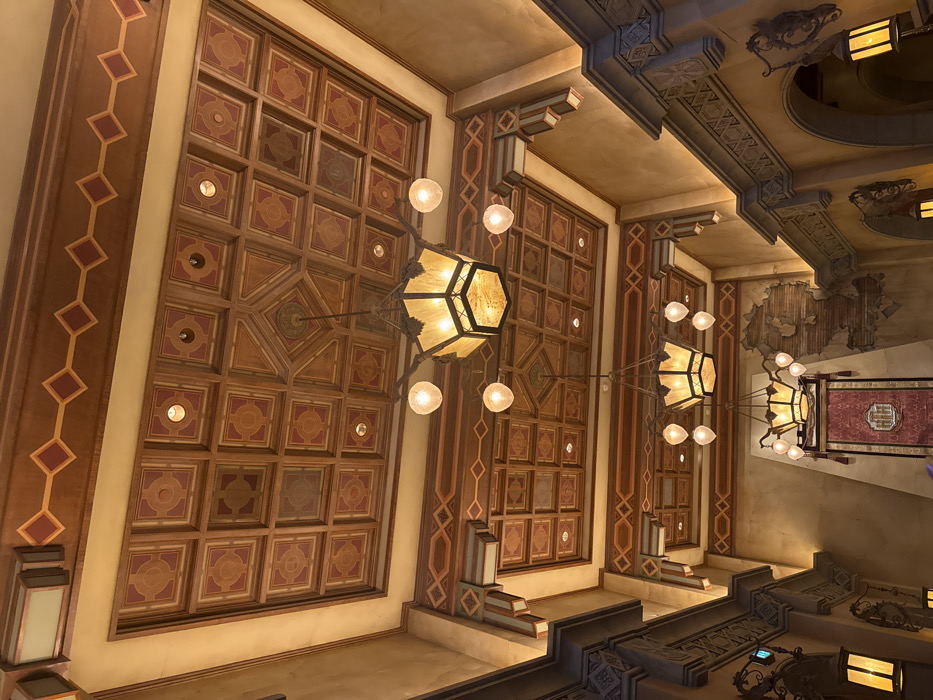 n ornate interior with intricate ceiling designs. The ceiling is divided into panels with geometric patterns and recessed lighting. Two large, multi-faceted light fixtures with glowing globes hang from the ceiling. The walls feature decorative columns and moldings with repeated geometric motifs. The space has a vintage or historical aesthetic, with a warm color palette and detailed craftsmanship. Stairs with decorative ironwork railings are partially visible.
