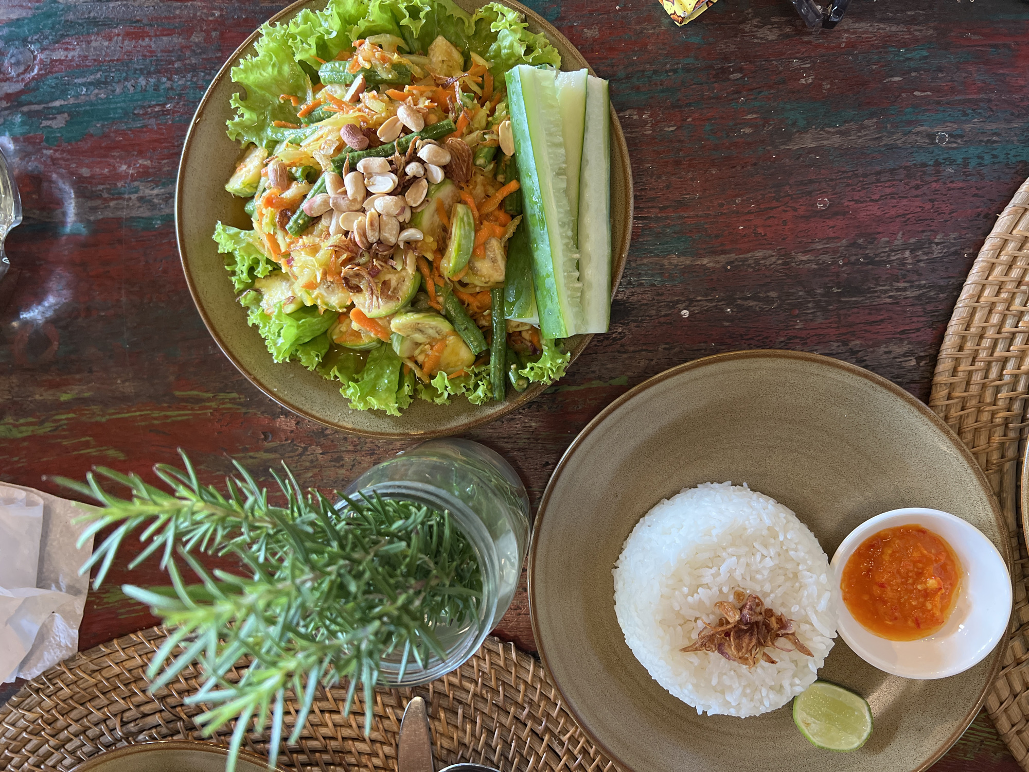 A top-down shot depicts two brown plates on a weathered, multi-colored wooden surface, likely a tabletop. The surface shows signs of wear, with patches of red, brown, and teal paint. The plate on the left features a salad with lettuce as the base, topped with a mixture of shredded carrots, green beans, peanuts, and what appears to be fried shallots. Cucumber sticks are arranged along the edge of the salad. The plate on the right contains a mound of white rice, garnished with fried shallots. A small white bowl of orange sauce and a lime wedge are also present. A glass jar filled with water and rosemary sprigs is positioned between the two plates. Part of a woven wicker placemat is visible on the right side of the frame. The location is Unknown, Indonesia. There are no people depicted in the image.