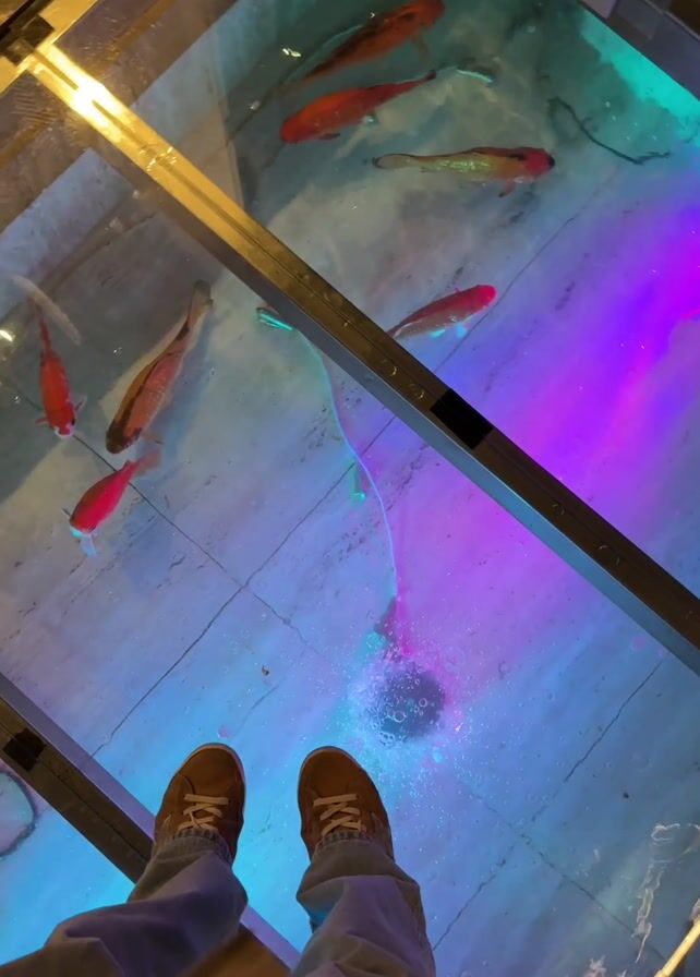 person standing on a clear glass floor, beneath which is an aquarium with several red and orange fish swimming around. The person is wearing tan shoes and blue jeans. The aquarium is lit with blue, green, and purple lights. There are small bubbles rising from the bottom of the aquarium. The camera is pointed down at the floor. The video appears to have been taken indoors.
