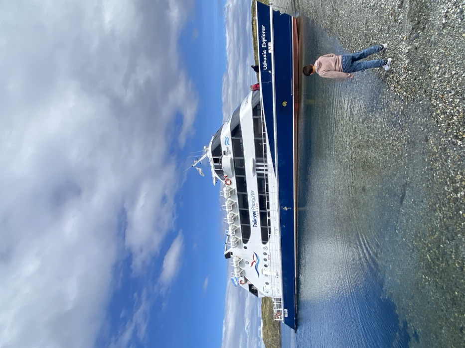 A passenger ferry named "Ushuaia Explorer" sits dockside, partially in the water