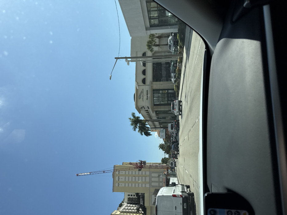 A street view from inside a vehicle, showing traffic on a sunny day. Tall buildings line the road, including a Jaguar Palm Beach dealership. A construction crane is visible near a light-colored building. Palm trees and streetlights are interspersed along the road.