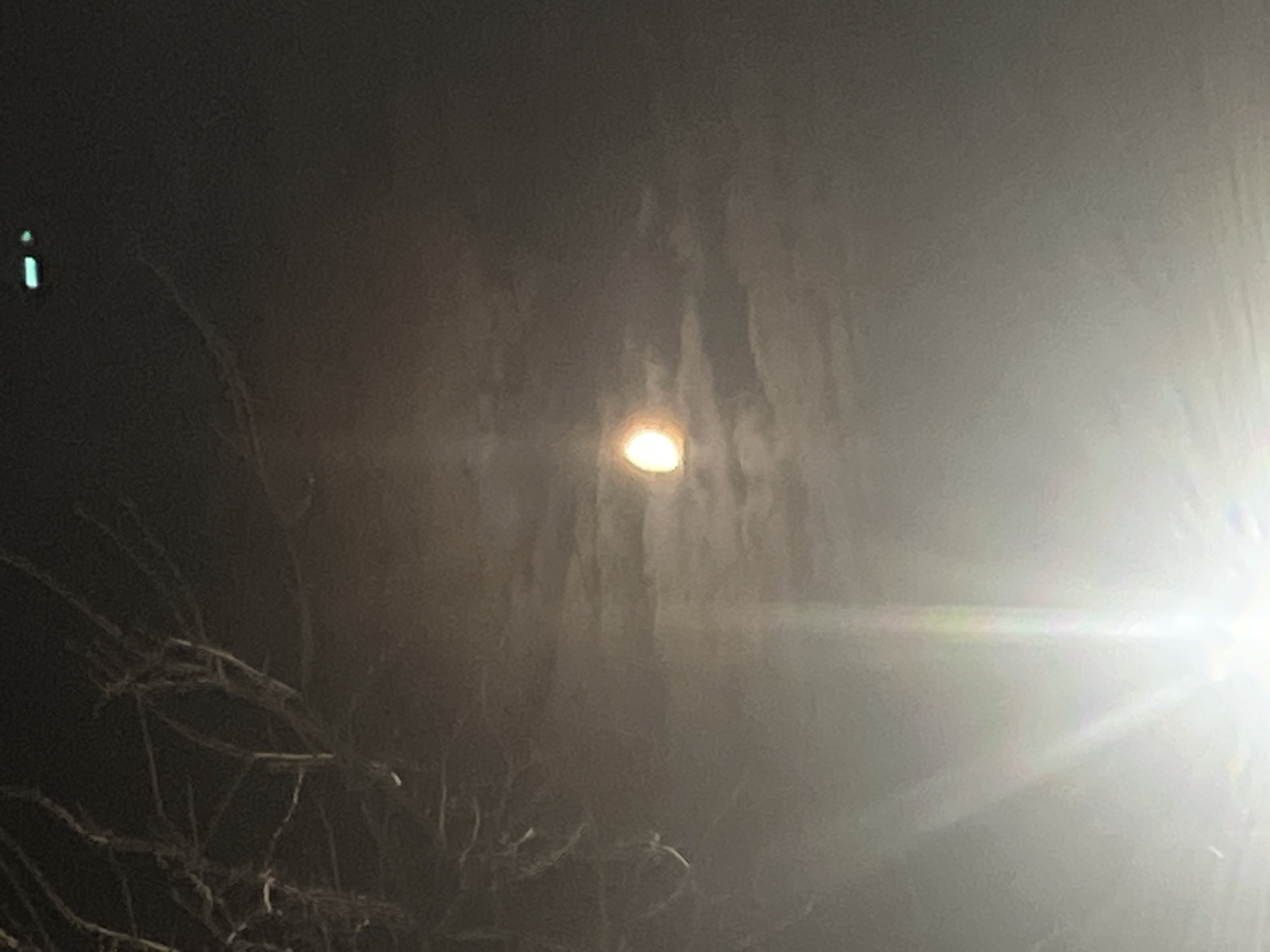 The image depicts a nighttime outdoor scene in Lupanovo, Russia. The sky is dark and partially obscured by diffuse clouds. A bright, oval-shaped celestial object, likely the moon, with a yellow-orange hue, is visible near the center, partially veiled by these clouds. A significant lens flare emanates from the bottom center, creating a strong vertical beam of white light extending upwards and radiating across the lower portion of the frame. In the upper center-right, a small, horizontal turquoise-green light with a smaller dot to its right is present. Bare tree branches are silhouetted against the dark sky on the upper left side of the frame. No individuals, explicit subjects, or interactions are discernible within the scene.