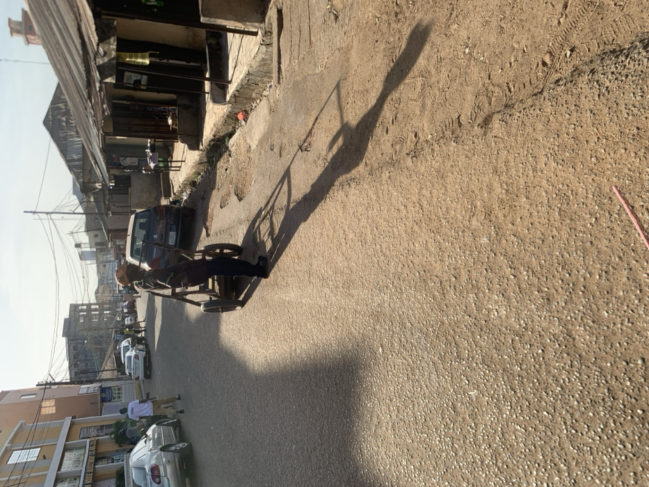 The image depicts a daytime street scene in the city of Dadi Riba, Nigeria. In the immediate midground, a male subject wearing an orange cap, dark shirt, and dark trousers stands facing right, holding the handles of a two-wheeled pushcart constructed from wood and metal. His elongated shadow and that of his cart extend across the road towards the lower right of the frame. The road surface exhibits a clear division: the left side is a relatively smooth, dark asphalt or tarmac pavement, while the right side is an unpaved, lighter-colored dirt and gravel surface with multiple visible potholes and tire tracks. A narrow, concrete drainage ditch runs along the far right edge of the road, fronting a row of single-story structures with corrugated metal roofs, functioning as small shops or stalls. In the background on the left, several parked vehicles, including a silver sedan, are visible on the paved section of the road. Further down this side, multi-story buildings with light-colored facades, one displaying partial signage indicating "HOUSE" and "INVESTMENT," line the street. Several other individuals are present on the paved road, either standing near vehicles or walking further in the distance. On the right side of the midground, a dark blue sedan, appearing to be a Peugeot, is parked on the unpaved shoulder. A dense network of overhead electrical wires is visible against the clear sky above the buildings in the distance. The scene is brightly illuminated by direct sunlight, casting distinct, long shadows, suggesting either morning or late afternoon. A small, pink rod lies on the ground in the lower center foreground.