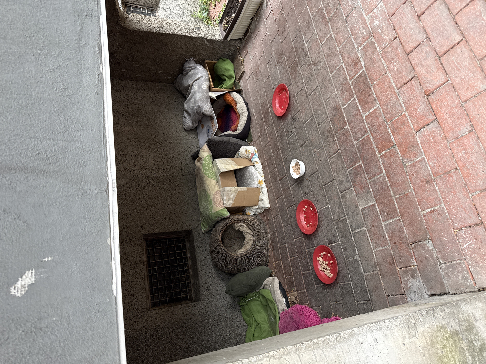 A high-angle shot depicts a recessed area adjacent to a brick-paved walkway, likely in an urban setting. The area contains an assortment of items, including bedding, a cardboard box, a woven basket, and several dishes. Two red plates contain what appears to be dry pet food, while a small white dish contains a smaller amount. The items are seemingly intended for animals, potentially stray cats. The scene suggests an ad-hoc feeding or shelter setup. While I do not have location information in Plovdiv, Bulgaria, I can see the objects in the picture. The scene gives the impression of neglect or marginality.