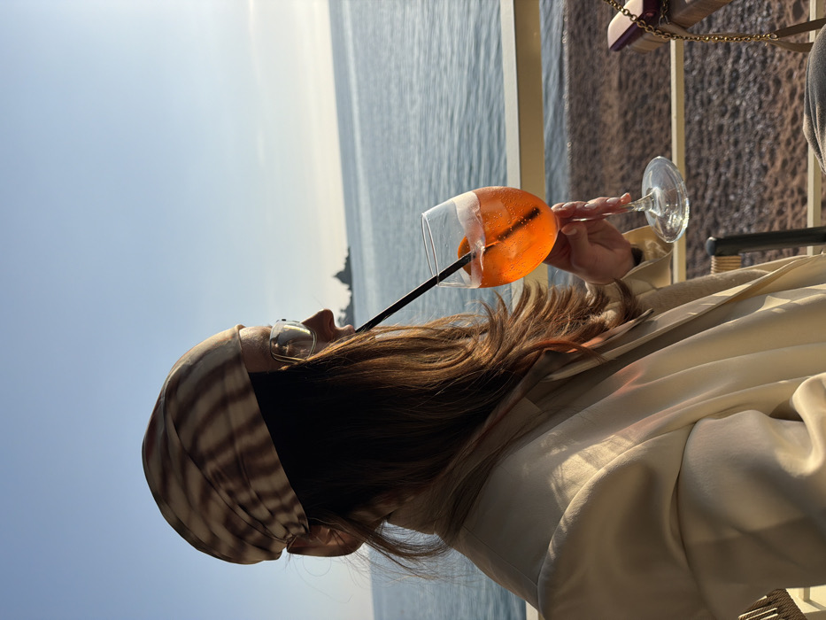 A female individual is depicted in profile, facing right, looking out over the Adriatic Sea from a coastal establishment in Petrovac centar, Montenegro. She wears a light-colored, striped headscarf and clear-rimmed glasses, with her dark brown hair flowing down her back and shoulder. She holds a stemmed glass containing a vibrant orange beverage, ice, an orange slice, and a black straw. The sun illuminates her hair and light-colored, long-sleeved attire, suggesting a bright day. In the background, the tranquil sea stretches to a clear horizon under a pale blue sky. The distinctive rocky islets of Katič and Sveta Nedjelja are visible in the mid-distance, off the coast. A light-colored railing is present in the lower frame, and a pebbly beach is visible directly below it. A dark table surface with a small, light-colored object is partially visible to the right.