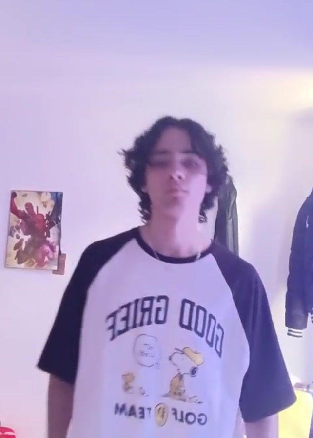 A young man with dark, curly hair stands indoors in front of a white wall. He wears a white t-shirt with black sleeves and an image of Snoopy and the words "Good Grief Golf Team" printed on the front. He also wears a silver chain. In the background, a framed picture of Spider-Man is on the wall to the left, and a guitar case and a jacket hang on the wall to the right. The man makes gestures with his hands near his face.